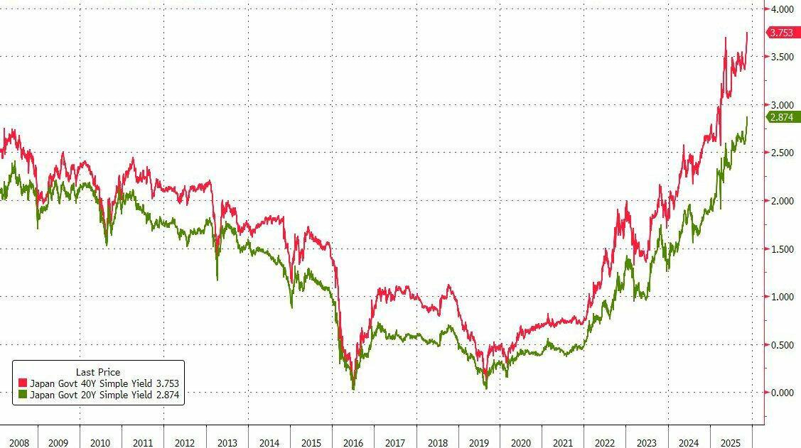 Questa tensione è ben visibile nel grafico che segue, che mostra l’andamento dei rendimenti dei JGB a 20 e 40 anni dal 2008 al 2025.