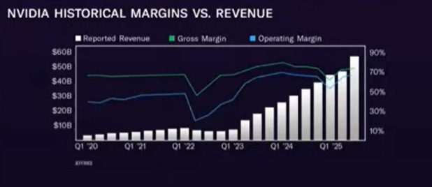 Le barre bianche mostrano una crescita quasi verticale dei ricavi dal 2023 in avanti, mentre le linee azzurre dei margini mettono in evidenza due indicatori fondamentali: il margine lordo – cioè quanto resta a NVIDIA dopo aver coperto i costi di produzione dei chip – vicino al 75%; il margine operativo – che rappresenta il guadagno effettivo dell’azienda dopo tutte le spese di gestione – intorno al 60%.