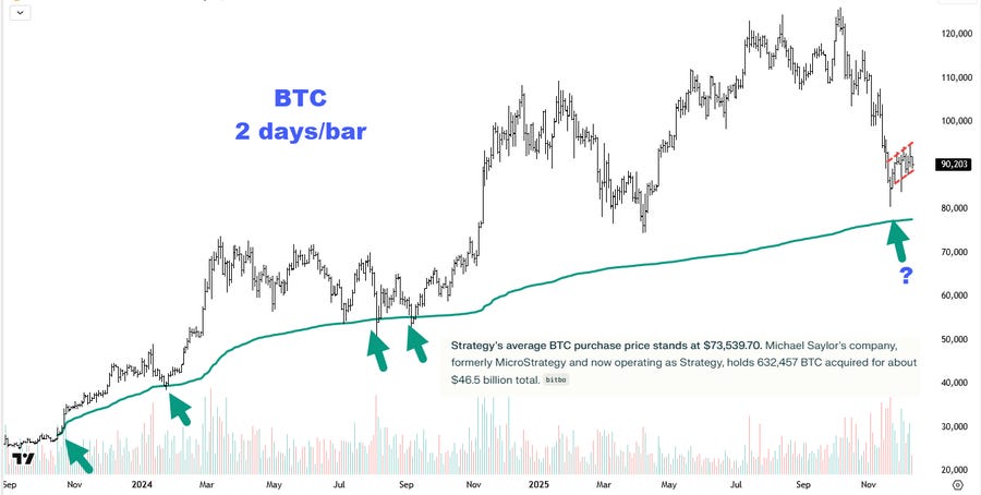 È una lettura diffusa tra trader e investitori più orientati all’analisi tecnica, soprattutto in un contesto in cui grandi player come Michael Saylor, attraverso Strategy, hanno accumulato oltre 632mila Bitcoin a un prezzo medio intorno ai 73mila dollari, contribuendo a rafforzare la narrativa di lungo periodo sul comparto.