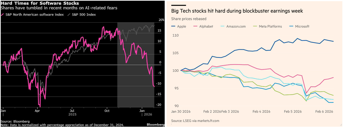 A sinistra si osserva la debolezza dell’indice dei software; a destra la reazione negativa delle Magnificent 7 in una settimana di risultati robusti.