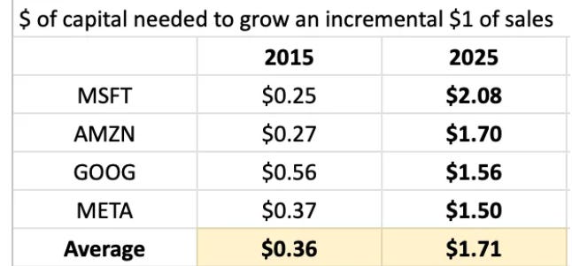 Il capitale necessario per generare un dollaro aggiuntivo di vendite è passato in media da 0,36 a 1,71 dollari in dieci anni.