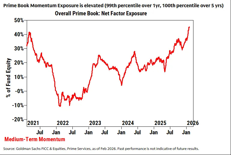 Il grafico mostra quanto fosse elevata l’esposizione al fattore momentum nei portafogli dei fondi hedge monitorati dai Prime broker – le grandi banche d’investimento che forniscono servizi di trading e finanziamento agli hedge fund – espressa come percentuale dell’azionario.