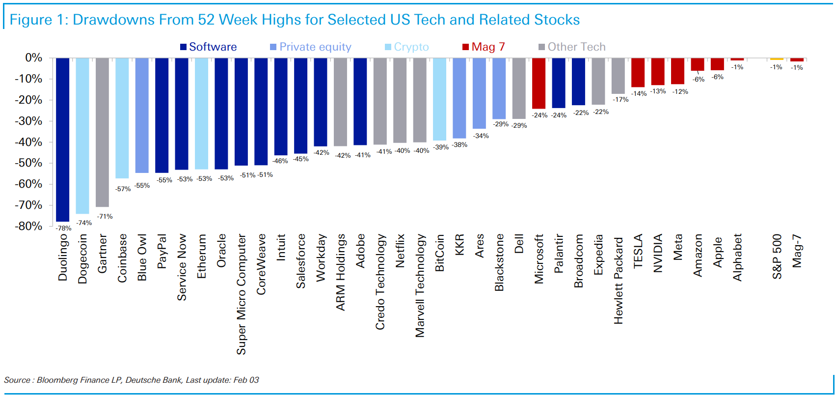 Qui la dispersione è evidente: software, private equity e crypto mostrano cali più profondi rispetto alle Magnificent 7 e all’S&P500.