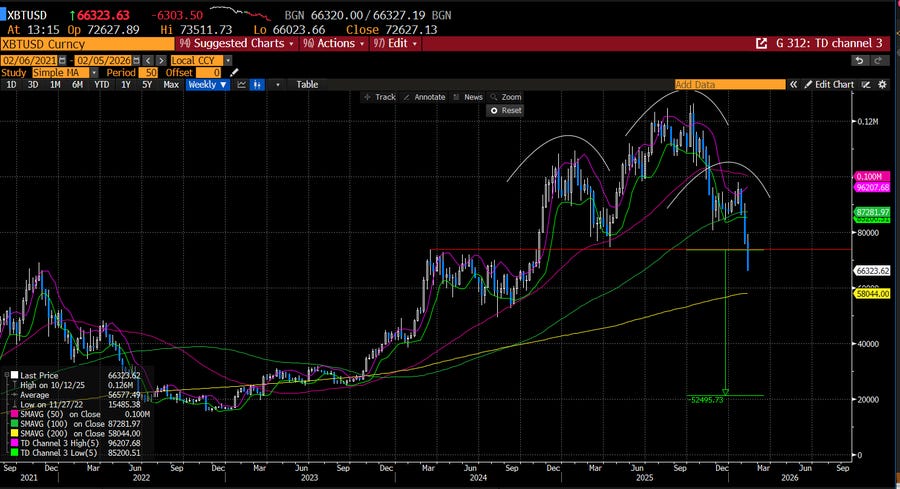 Per capire perché questa fase assomiglia più a un cambio di regime che a una normale presa di profitto, osserviamo il grafico che segue, che mostra l’andamento del prezzo del Bitcoin negli ultimi anni, con la recente rottura dei principali livelli tecnici dopo la fase di euforia.
