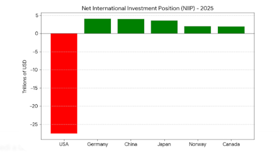 Il messaggio è netto: gli USA presentano una posizione fortemente negativa (circa -27 trilioni), mentre Germania, Cina e Giappone mostrano saldi positivi, cioè sono creditori netti. Norvegia e Canada risultano anch’essi in territorio positivo, ma con dimensioni più contenute.
