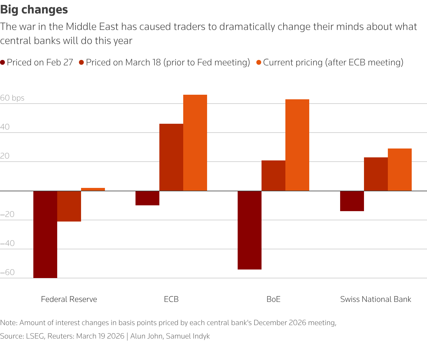 Di fronte a questo quadro, non sorprende che le aspettative sui tassi siano cambiate rapidamente: il grafico che segue mostra come le stime sulle mosse delle principali banche centrali siano state riviste tra il 18 febbraio e il 18 marzo, prima e dopo la decisione della BCE: