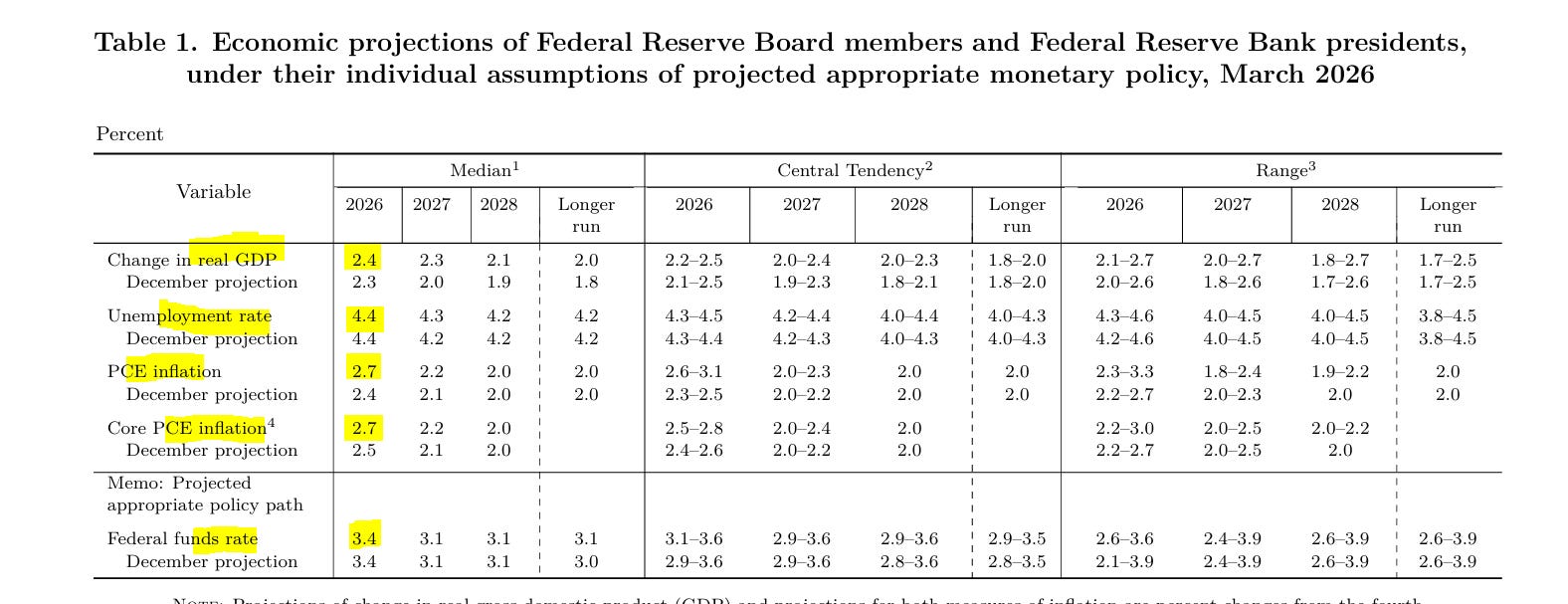 La prudenza della Federal Reserve emerge chiaramente dalle nuove proiezioni macroeconomiche, sintetizzate nella tabella che segue: