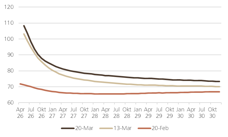 Nella parte iniziale della curva, cioè sulle scadenze più vicine, i prezzi sono saliti con decisione: il mercato sta quindi incorporando un premio per il rischio geopolitico più elevato nel breve termine.