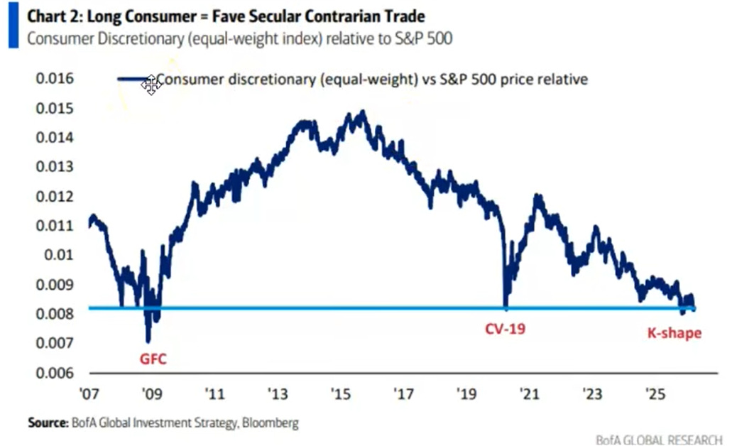 Dopo anni di progressiva debolezza, il comparto dei consumi discrezionali è tornato su livelli storicamente molto bassi, simili a quelli osservati durante la crisi finanziaria globale e nel periodo del Covid.